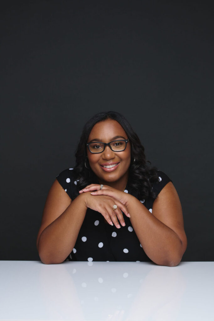 mage Description: Ashley is smiling and seated with her arms crossed in front of her on a white surface. She wears a black polka-dot blouse, glasses, and several rings, set against a dark backdrop.