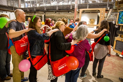 It was a far humbler production than Sweet & Lucky. That show required an elaborate, multi-room performance space; Travelers took place in the public halls of Stanley Marketplace. Instead of an immersive-theater expert from Brooklyn, Off-Center worked with a local comedy troupe. There were no elaborate props or decorations, just tote bags with trinkets like crayons and diffraction glasses that visitors used during the performance.